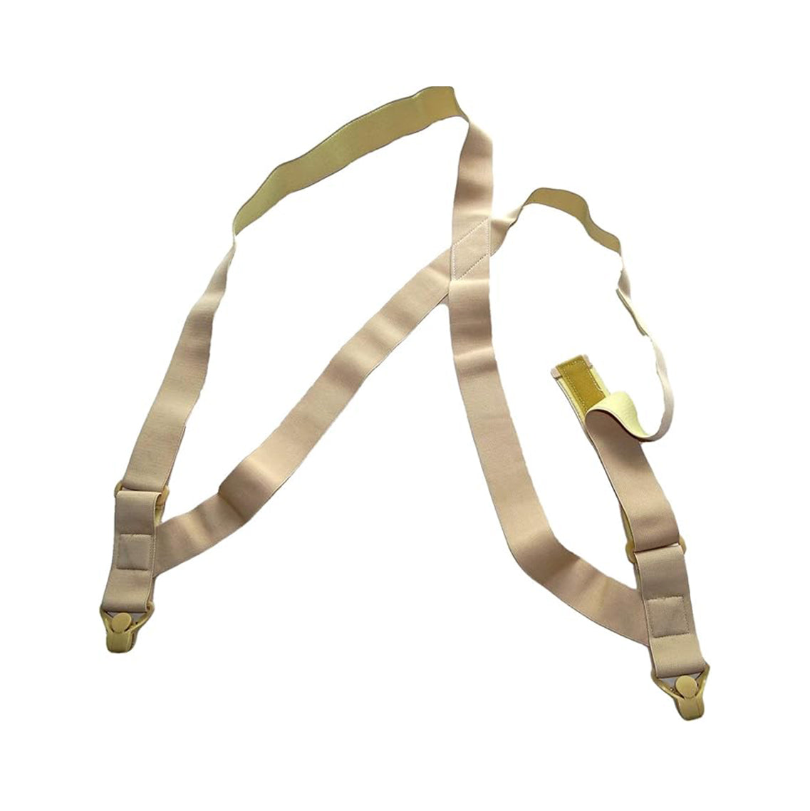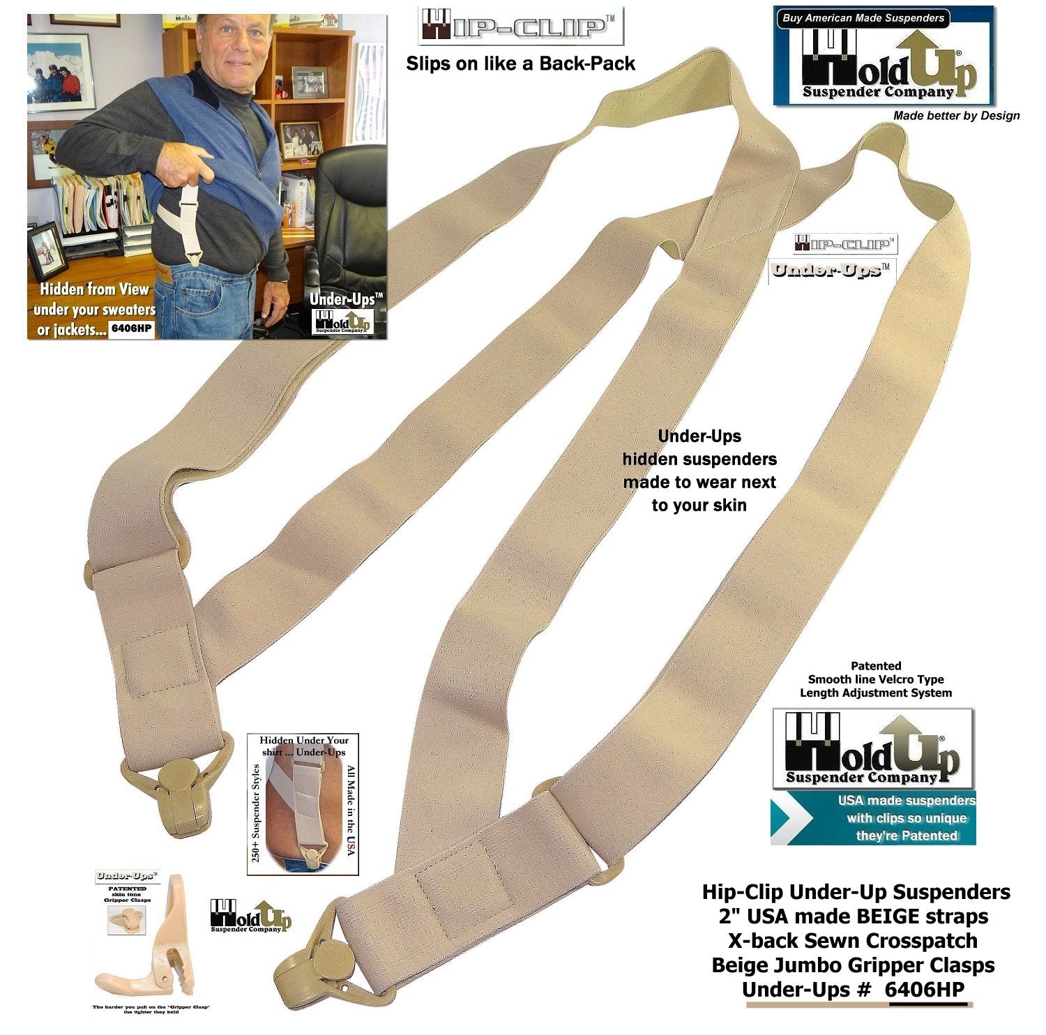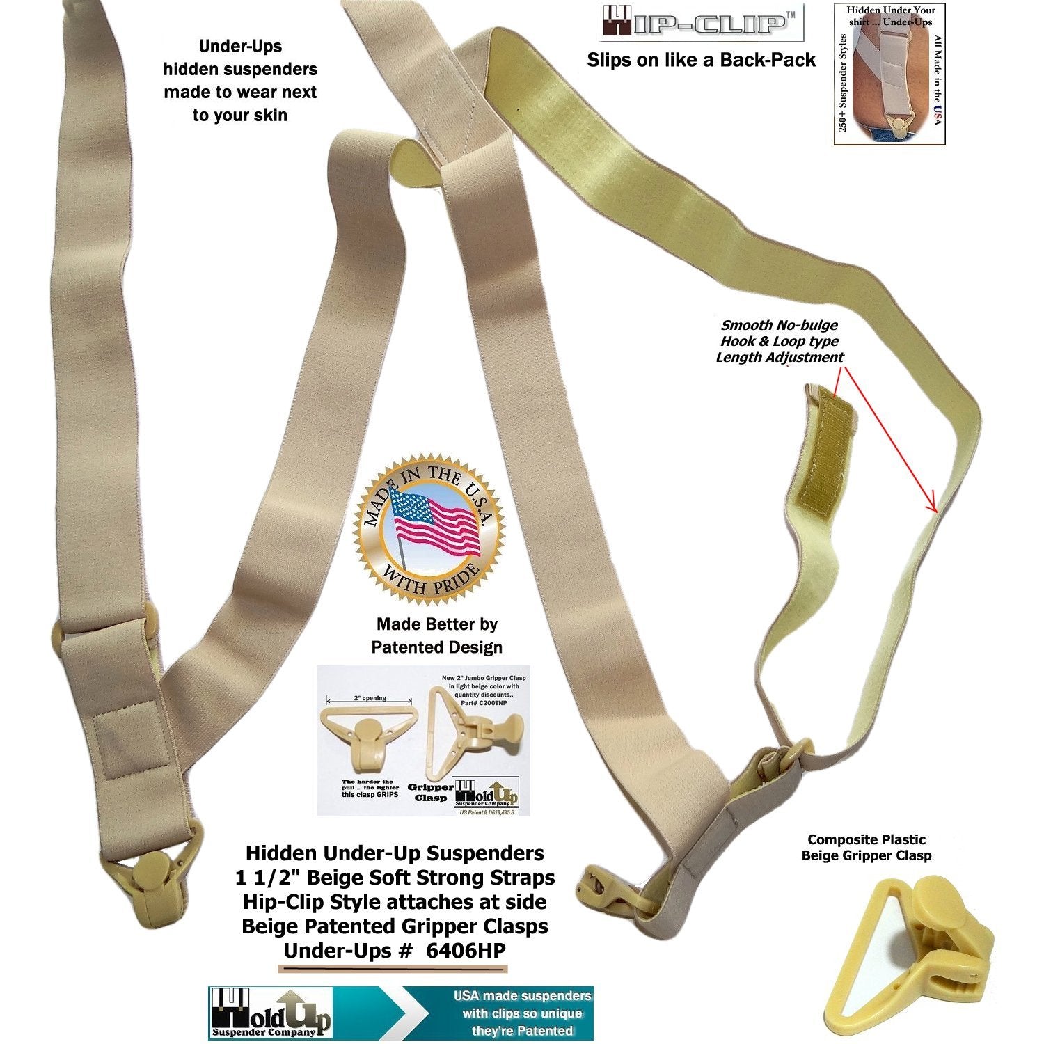 HoldUp Suspender Company makes these Undergarment Suspenders in light beige color that won't trigger metal detectors and attach at the side of your pants or shorts with 2 patented gripper clasps. These Under-Up undergarment suspenders are perfect for anyone who prefers to wear suspenders under there shirts for a No-Show appearance. These No-Alarm airport friendly suspenders are made to fit who prefer wearing suspender under their shirts in total comfort. You'll feel comfortable all day long using these soft to your skin smooth dense weave side clip suspenders that slip on like wearing a backpack. Hand washable Underups are Super-Soft to the Skin and absorb sweat and you'll hardly know your wearing these to securely hold up your pants or shorts. The American made 1 1/2" wide straps have a Smooth Cotton Poly-Blend Soft Elastic weave like a thick ACE Bandage fabric.These light beige hidden undergarment trucker suspenders are trademarked as Hip-Clips and have a double sewn X-back crossover strap and have no bulges showing or buckles digging into you back