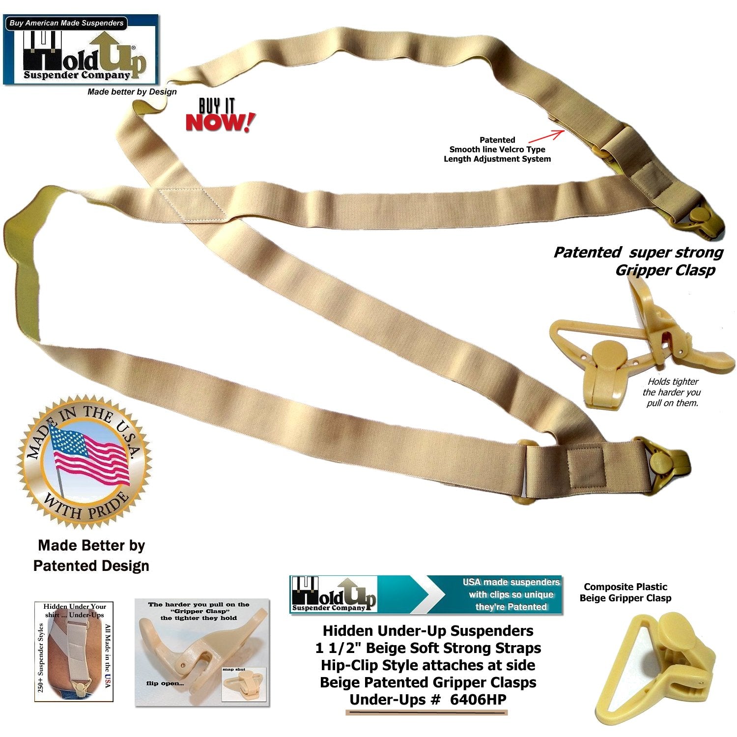 Tan Under-Up Series undergarment hidden Suspenders with Patented Beige Super Strong Gripper Clasp From HoldUp Suspenders Brand are made in the USA