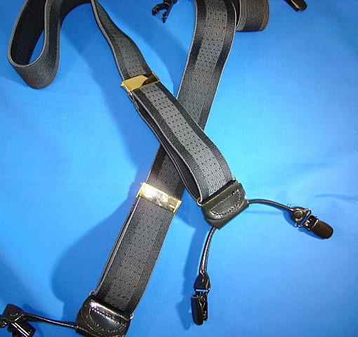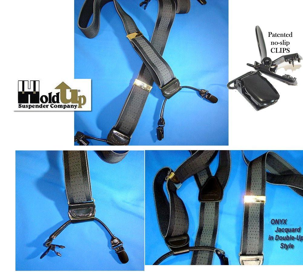 Sal Herman, the President of Holdup Suspender Co., worked for years to perfect these stunning braces most popular with actors, doctors, businessmen, students, and professors. By eliminating the custom tailoring requirement to sew suspender buttons onto every pair of pants you wish to wear with suspenders...now you can easily attach your Jacquard Double-Ups to your entire wardrobe of pants in a snap. Get the aesthetic look of old style button-on braces with the convenience and ease of our no-slip clips. Exclusive design feature of these suspenders is we eliminate the proverbial waistband rollover caused by button-on braces, which pull at the middle of the waistband. These are just as great with slacks, jeans or dress pants for both a casual and dressy look at the snap of a clip. The jacquard weaving process allows for a blending of the shades of the same color to produce a stunning pair of suspenders. These are great for office or casual wear when you need to make a fashion statement! Pick out several pair in your favorite colors, which all have Y-backs and top grade black leather tabs and our logo embossed on the double stitched crosspatch. Great as a birthday, Fathers Day or special occasion gift. All materials are carefully chosen for elastic durability with a fine weave and colorfast dyes. If you need a pair of suspenders that perform year after year...then we'd always suggest a pair of Holdup Suspenders for you or a friend. The Black Onyx color Jacquard series are in stock now at this low price and you can choose free freight during checkout.