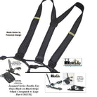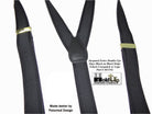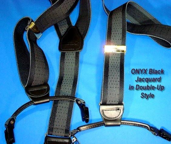 This USA patented 1 1/2" wide Jacquard Double-Ups men's suspender features a Black ONYX black on black color mix woven into a mute tasteful stripe. These dressy black suspenders feature two newly re-designed no-slip suspender clips on each black leather tapered clip tab holder. Designed in the USA so they will last through years of wear and they adjust to fit men to 6 feet tall. This traditional style mirrors the look of button on suspenders worn since they were first invented without the hassle of sewing on suspender buttons.