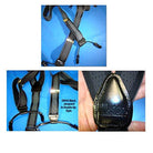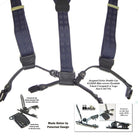 - 1 1/2" wide and 48" long Black-on-Black jacquard woven elastic fabric Double-Ups with Y-back style and black leather crosspatch embossed with Holdup logo