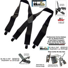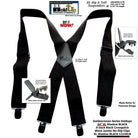 These Black XL rugged 2" wide and 54" Xtra long Heavy Duty suspenders are specifically designed for outdoor use in the harshest of environments with our USA Patented Jumbo black no-slip clips. These are great gifts for that deer hunter, motorcyclist, fisherman or construction worker that knows the power limitations of conventional black suspenders with cheap clips. All Holdup Outdoorsman suspender strap materials are carefully chosen for elasticity, durability and come with a black USA patented no-slip jumbo clip with locking needle sharp center pin that won't fray your pant waistband. These wide black work suspenders are guaranteed they'll never slip, slide, or fly off your pants. The patented plastic gripper clasps are cam activated which means the harder you pull on them the tighter they grip. These are the Extra Long (XL-54") 2" wide model made for the Big & Tall man and adjust to fit men up to 6' 6" or those with a wide girth. Black embossed leather X-back crosspatch shows the HoldUp logo so those will see your wearing this top quality Holdup brand black work suspender. The perfect all black wide work suspender for the big and tall man has arrived and you can buy these using your Amazon or PayPal account and get free freight offer at checkout.
