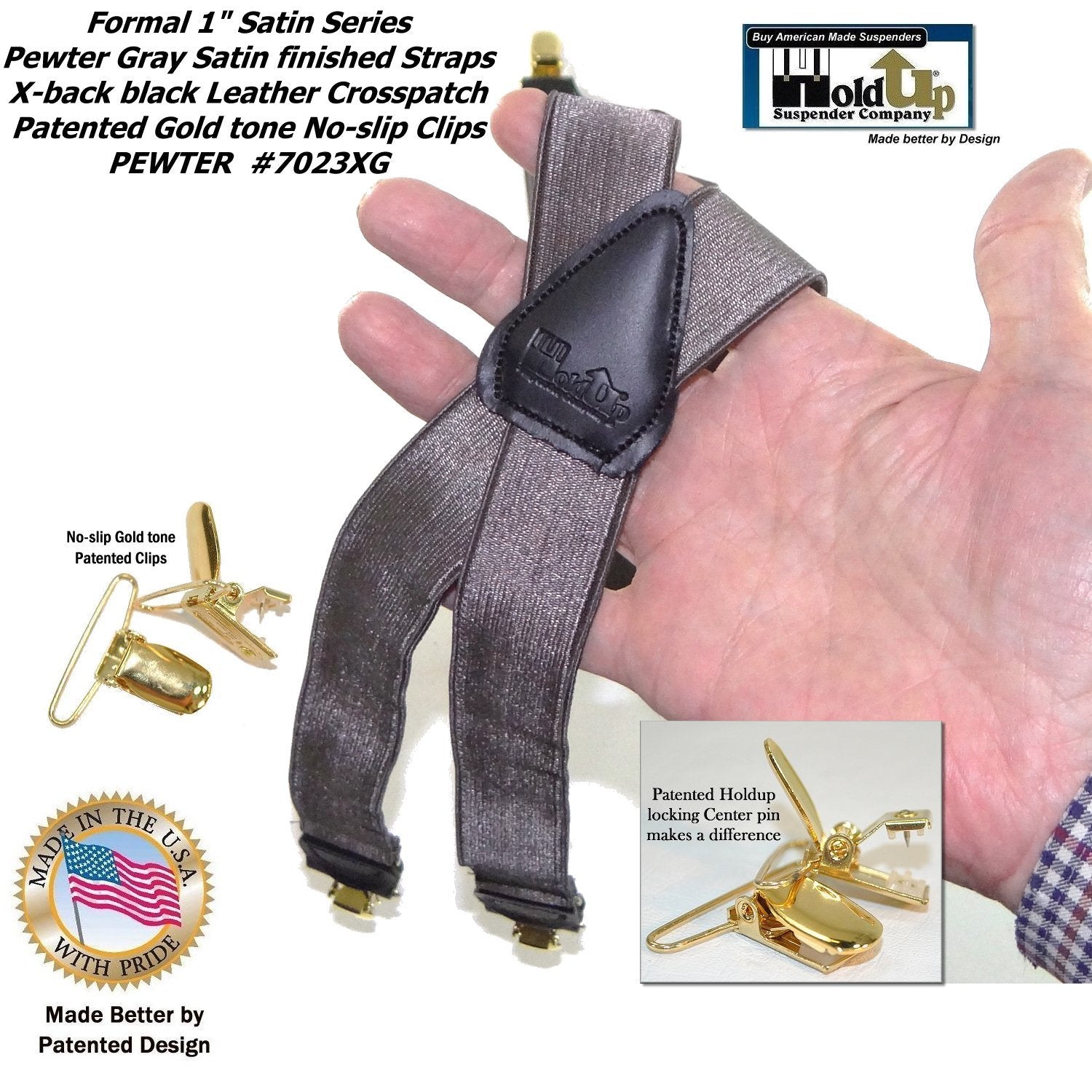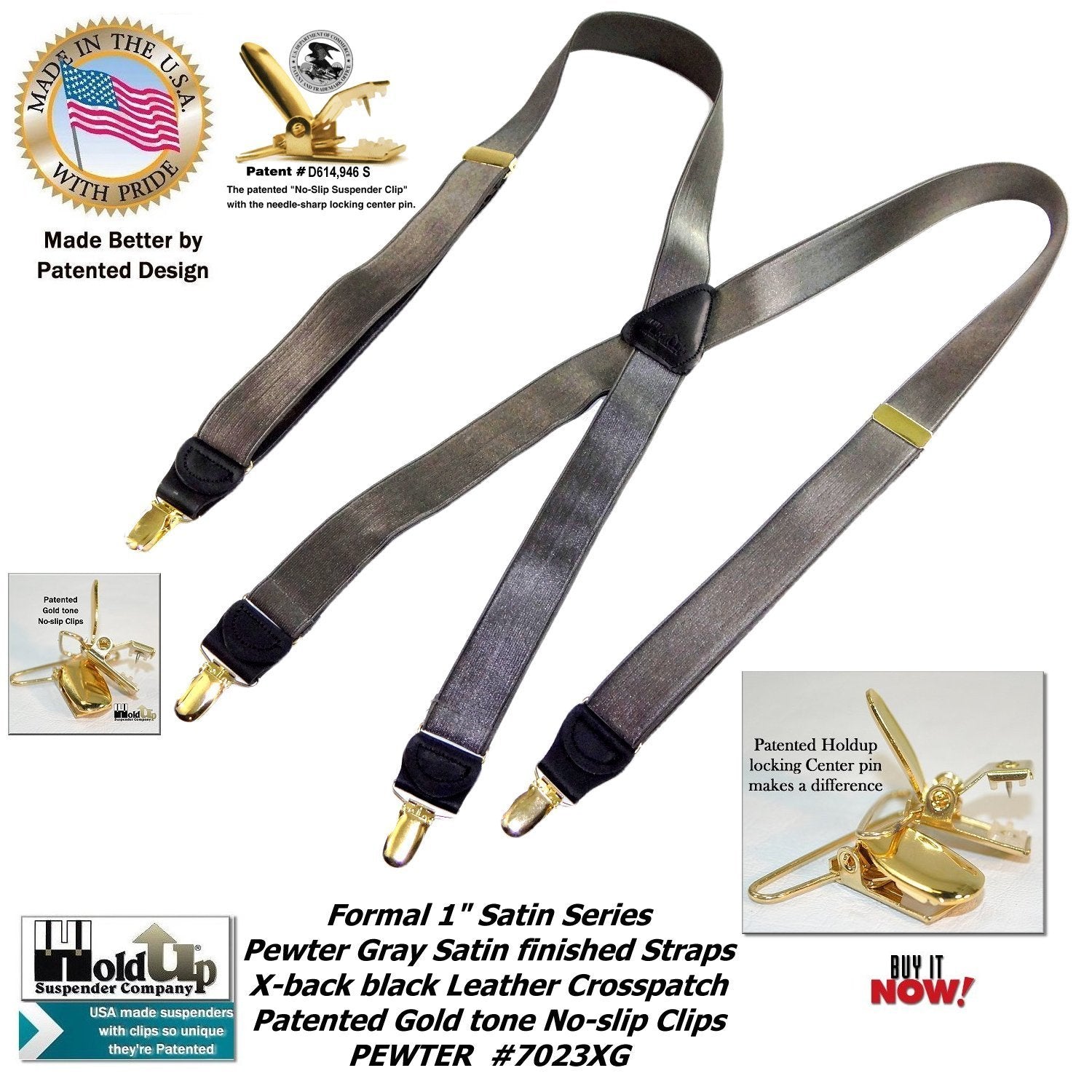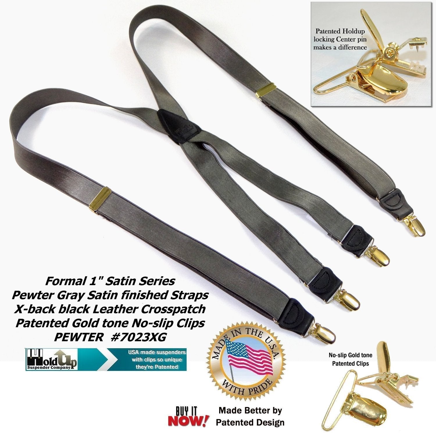 Holdup Brand Pewter Grey Satin Finished Formal Series 1" wide Suspenders X-back Gold clips