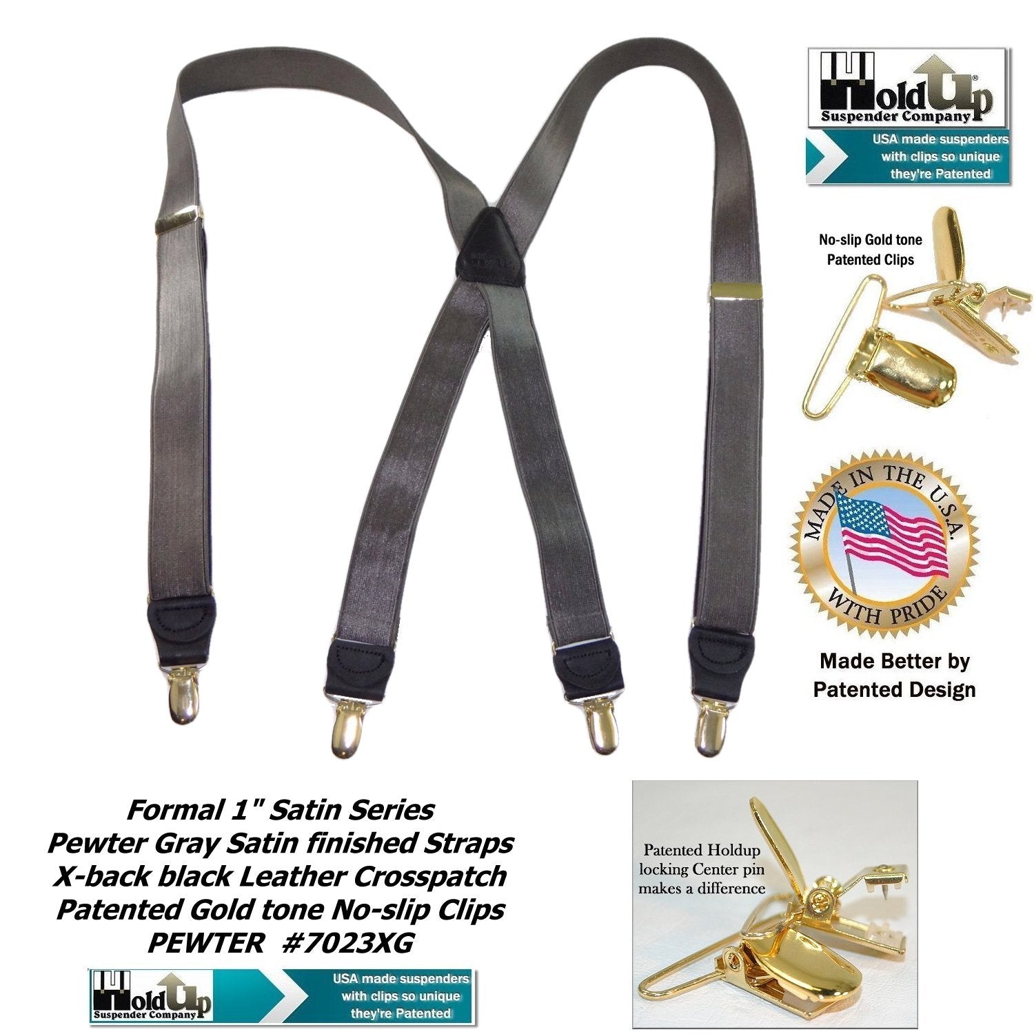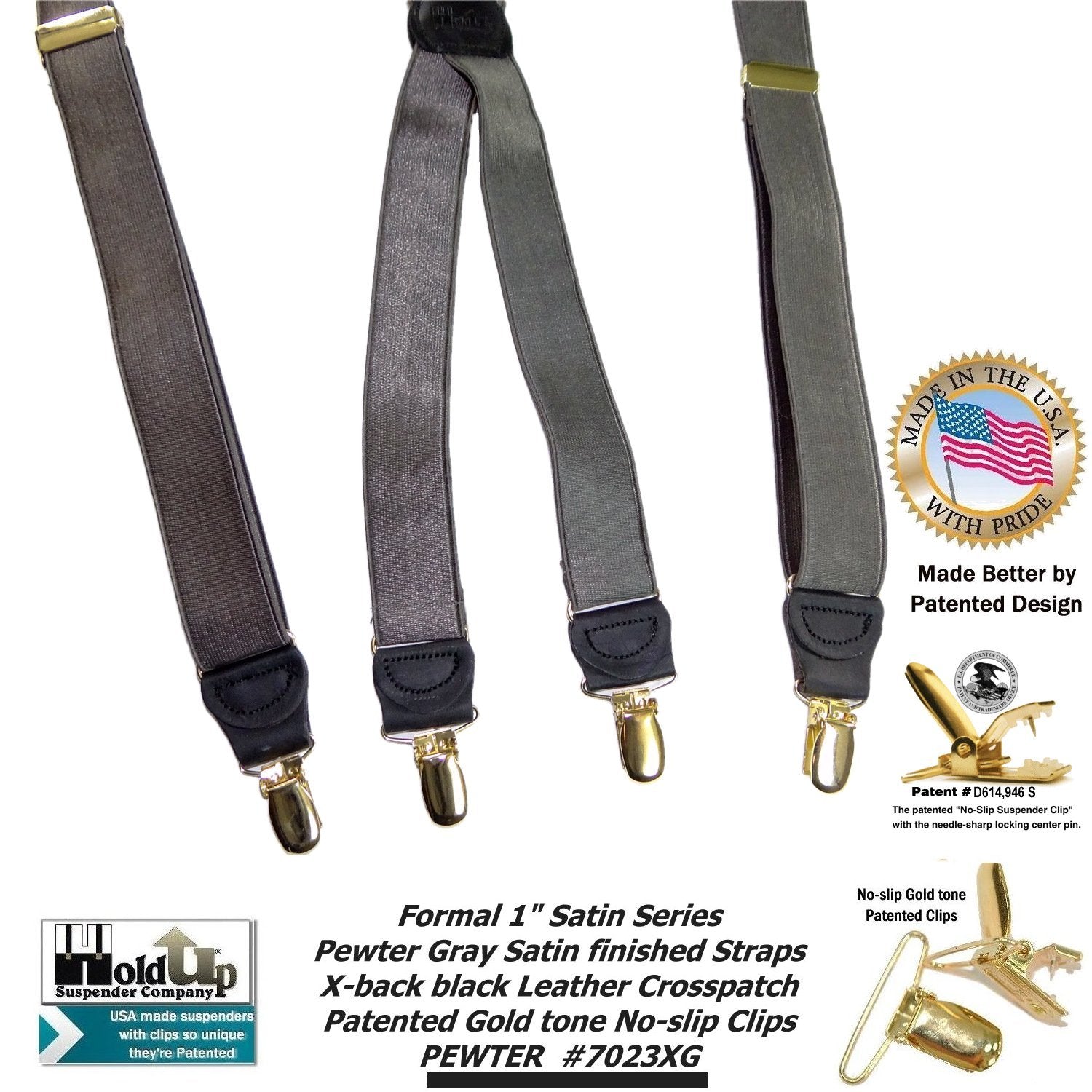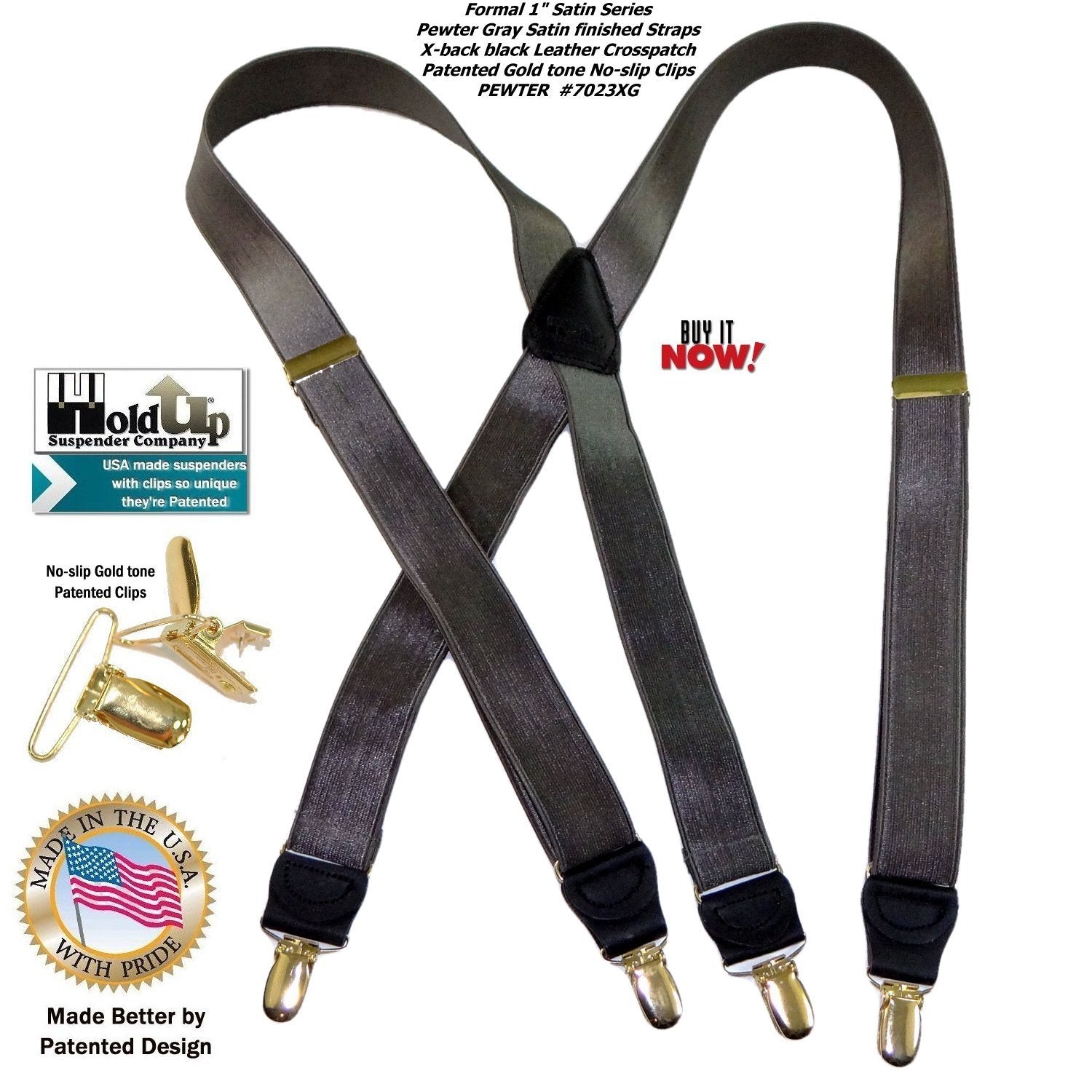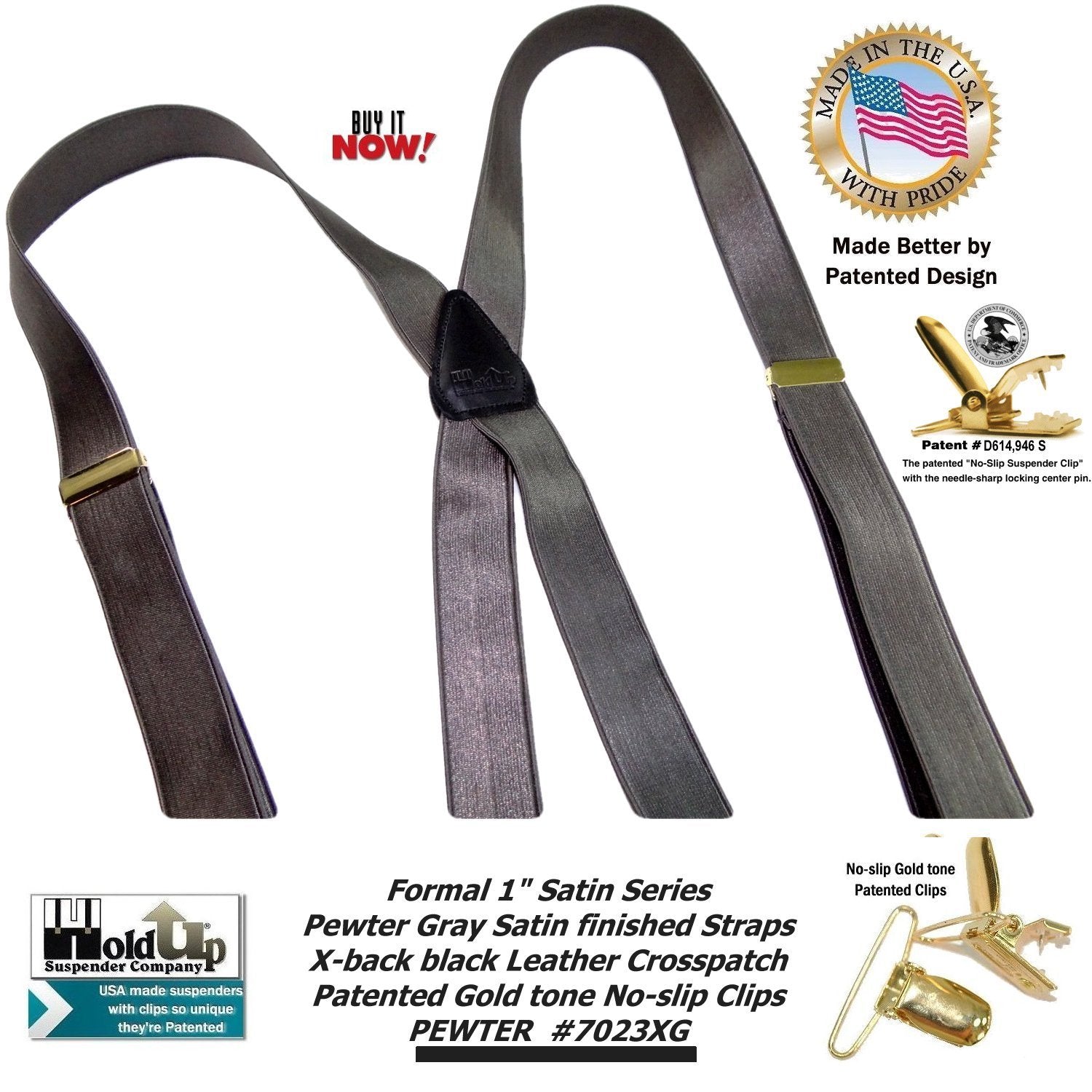 Holdup Brand Pewter Grey Satin Finished Formal Series 1" wide Suspenders X-back Gold clips