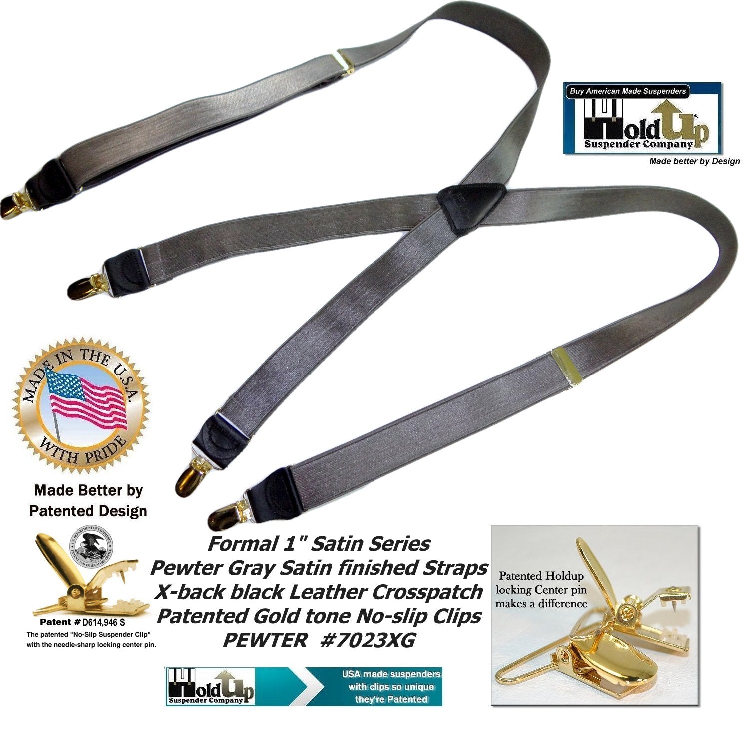 - Dark 1 inch wide Pewter Gray HoldUp formal X-back suspenders with a dense weave satin formal finish USA made 1" wide strap