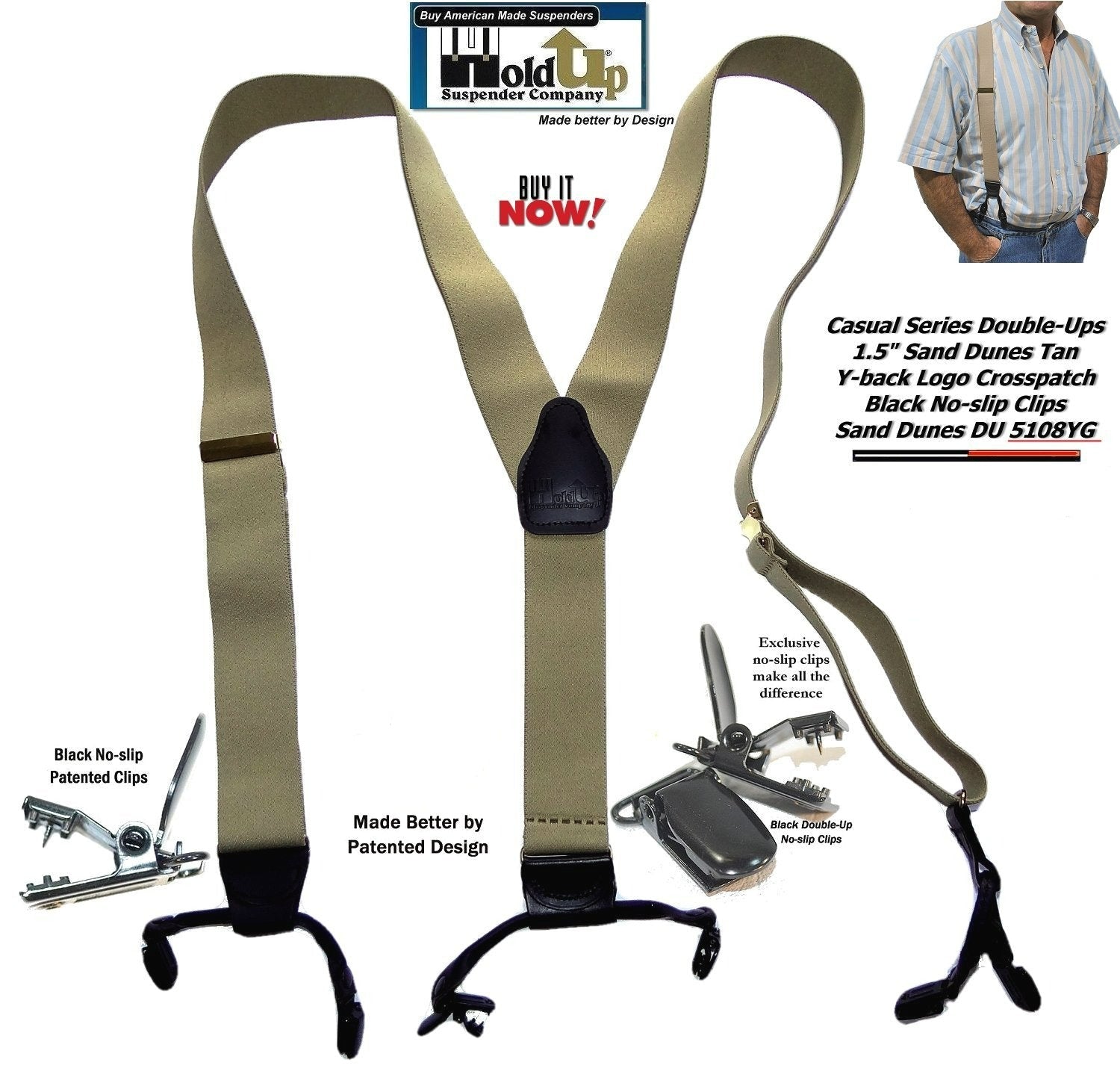 - Double-Up Light Sand Tan dual-clip suspenders have a 30 day money back guarantee