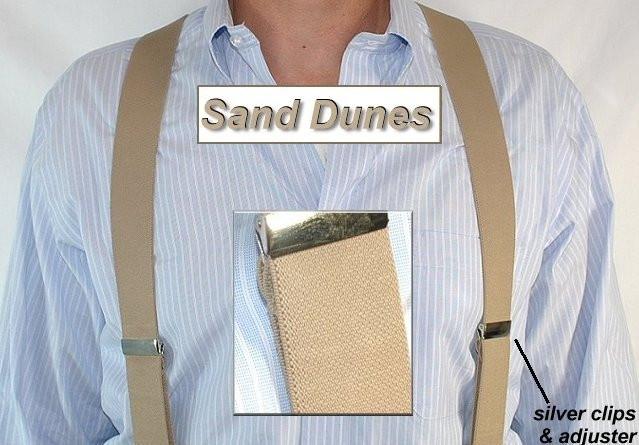 - Sand Dune Tan clip-on suspenders in Y-back style are made with Patented silver-tone no-slip center pin clips. Sold in over 2000 fines men's shops nationwide