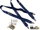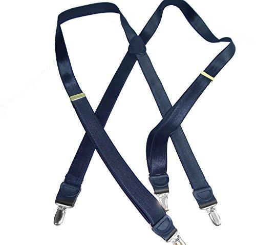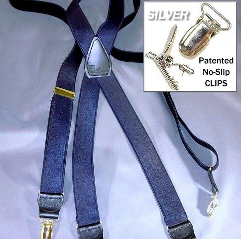 Hold-Up Suspender's Formal Wear Series clip-on suspenders in "SATIN BLUE" dark navy color featuring our patented NO-SLIP clip in silver/chrome tone. These new 1" width suspenders are in X-back style and are adjustable to 48" in length. The image above really doesn't do justice to the SATIN finished colors of these businessman's suspenders. The top grade black leather tabs and X-back crosspatch, add up to a more formal look. Why should you ever have to suffer through the agony of those cheap tuxedo rental shop pair that never seem to hold up. You owe it to yourself to get our exclusive formal series of men's suspenders designed for a lifetime of parties and social events. All materials are carefully chosen for durability, pleasing look and above all they'll never pop off at the least opportune time. Great gift idea for the men at your wedding or as a Father's Day present. Always Up for any occasion...buy several pair of these formal suspenders. Search Amazon for a full selection of colors and X- or Y-back and clip finish options. HoldUp's exclusive - FORMAL SERIES all have top quality elastic cloth specifically chosen for durability and lasting stretch. All come with the best saddle leather tabs that vary in size and taper front to back for more comfort and convenience when attaching them to your pants.