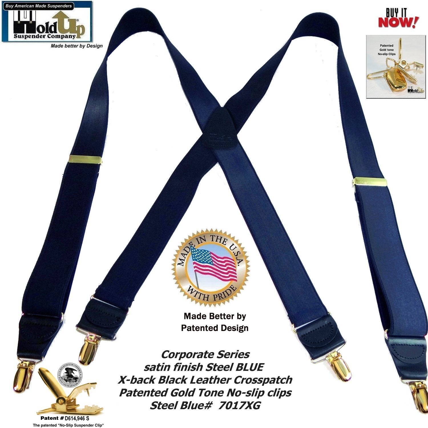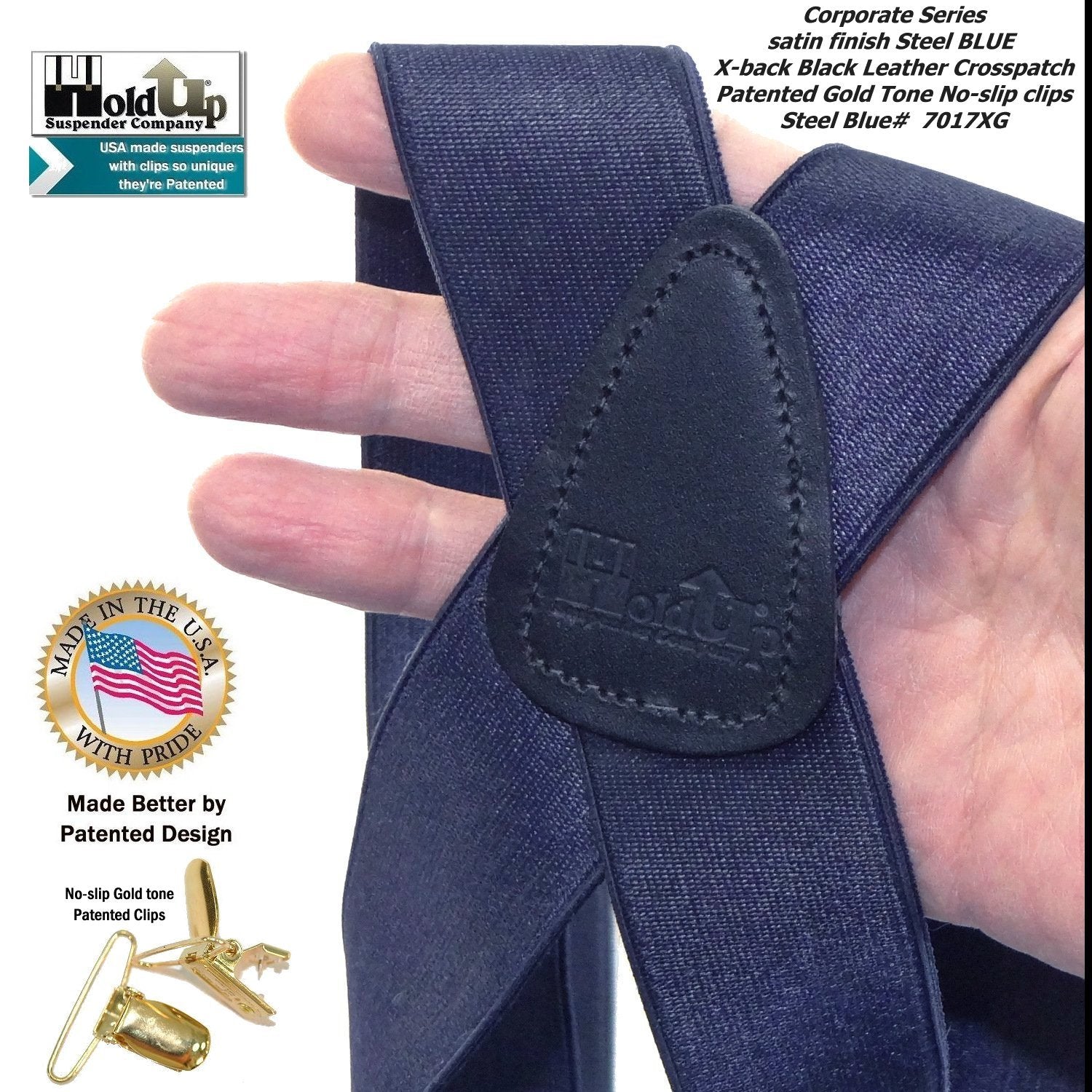 Holdup Brand Deep Steel Blue Satin Finish Suspenders In X-back style With Patented Gold Tone No-slip Clips