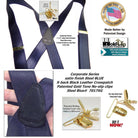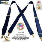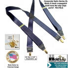 Holdup brand Corporate Series satin finished clip-on suspenders in a beautiful dark "Steel Blue" color featuring our patented gold toned NO-SLIP clips with locking center pin in the popular X-back style. The images shown here really don't do justice to the shiny SATIN finished color of these deep blue businessman's dressy office suspenders often seen worn at weddings, corporate parties and special events. The top grade black leather tapered clip tab holders and matching black leather Holdup logo embossed crosspatch add up to a more formal or business look. Why should you ever have to suffer through the agony of those cheap tuxedo rental shop pair that never seem to hold up or can't holdup your pants after a few days due to inferior clips. Our locking needle-sharp center pin won't fray pant waistbands while holding in place through years of wear.