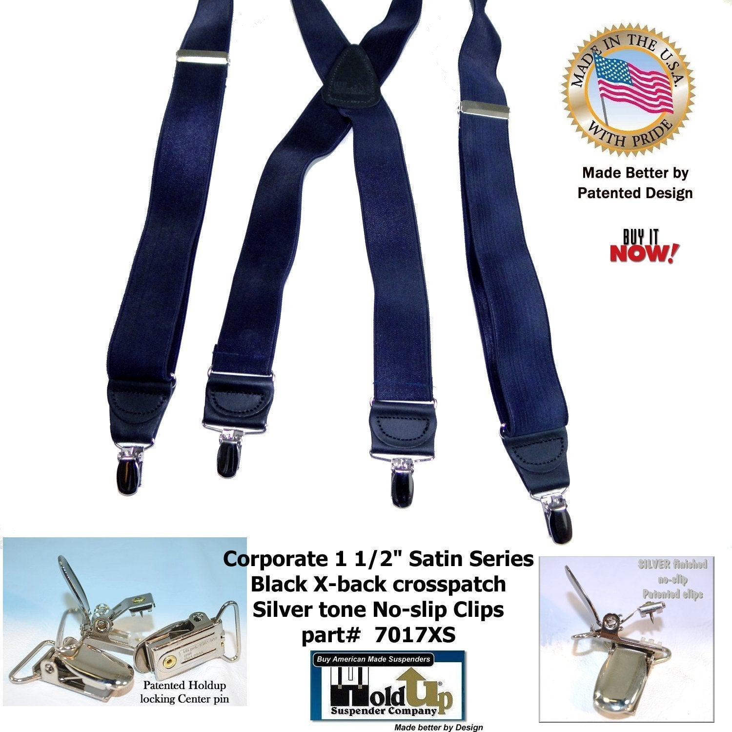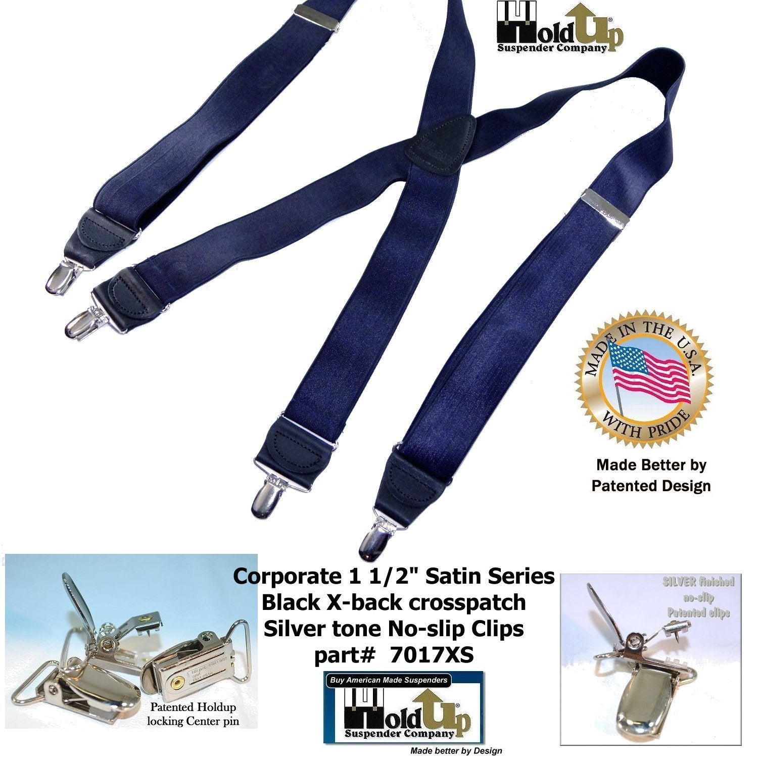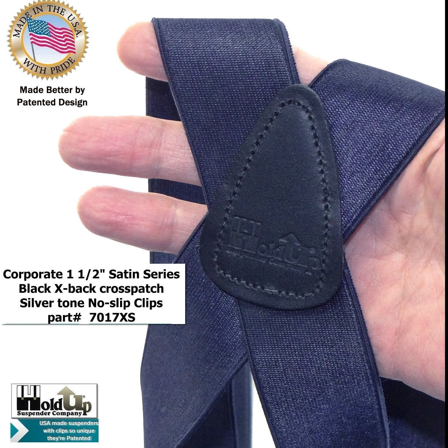 Our locking needle-sharp center pin won't fray pant waistbands while holding in place through years of daily wear. You owe it to yourself to get our exclusive Corporate Series of men's suspenders designed for a lifetime of parties and social events in this beautiful satin finished deep blue color. All satin finished dense weave strap materials are carefully chosen for durability, pleasing look and above all they'll never pop off at the least opportune time. Great gift idea for the men at birthdays, graduation, weddings or as a Father's Day present. Always Up for any occasion...buy several pairs of these dense smooth weave satin finished Corporate Series HoldUps in 9 colors with genuine black leather trim here at HoldupSuspenders.com. You can use your Amazon account for payment and Prime Members get FREE 2nd-day freight and 30 day money back guarantee. Buy these blue satin finished Holdup suspenders on the same order with any other styles and colors and save on freight. These have 48" straps, with a nickel/chrome tone metal length adjuster and black leather Crosspatch embossed with Trademarked Holdup logo.