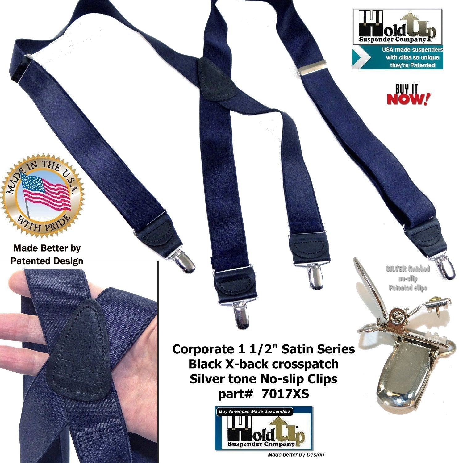 - Top Grade USA made Black Leather X-back crosspatch with matching tapered clip tab holders and rich satin finish on dense weave poly-blend strap.
