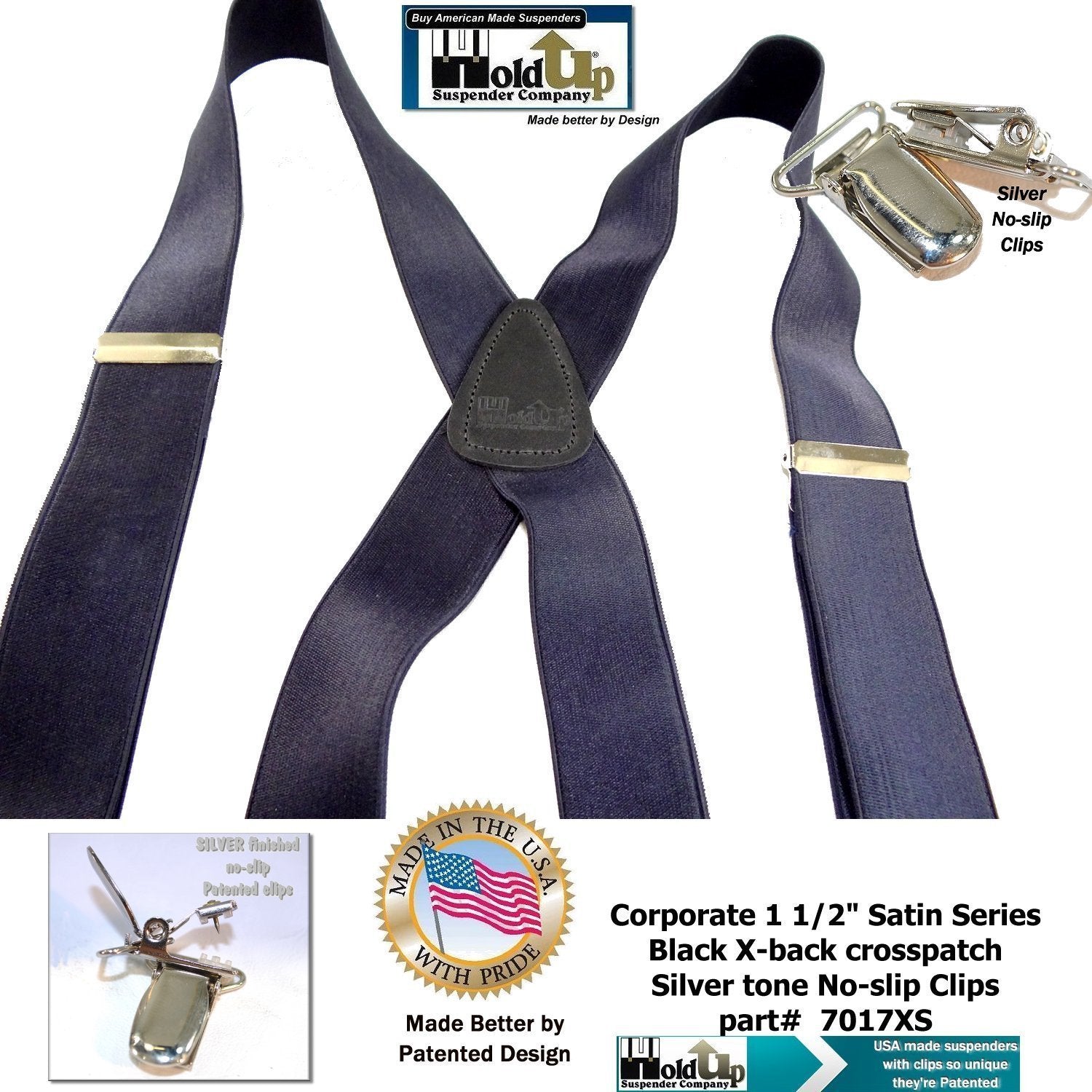 Holdup brand Corporate Series satin finished clip-on suspenders in a beautiful "Steel Blue" color featuring our patented nickel/chrome toned NO-SLIP clips in the popular X-back style. The images really don't do justice to the SATIN finished colors of these businessman's dressy office suspenders often seen worn at formal weddings, corporate parties, and special events. The top grade black leather tabs and black leather crosspatch add up to a more formal or business look. Why should you ever have to suffer through the agony of those cheap tuxedo rental shop pair that never seems to holdup, or fails at holding up your pants after a few days due to inferior clips. Try these Steel Blue Corporate Series Holdups for the next 30 days and we guarantee you'll love them or you get your money back. These are Made in the USA and well worth the price.