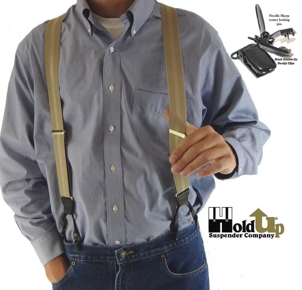 - Dual USA patented no-slip® black Hold-Up® clips in exclusive Double-Ups® style suspenders with real leather tapered clip tab holders.