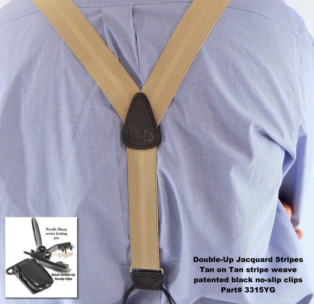 Jacquard Series Holdup striped tan on tan Y-back suspenders that are 1 1/2" wide and 48" long adjustable to comfortably fit men to six feet tall. The jacquard two-tone "Golden Tan on Tan" striped HoldUp suspenders in dual-clip Double-Ups style are sold here using your Amazon or PayPal account with a free freight offer at checkout. Jacquard Striped Hold-Ups tasteful tone-on-tone in tan and beige color weave creates a contrasting stripe in these Hold-Up Double-Up USA made suspenders. These come with a Y-back styled genuine black leather crosspatch with matching black leather dual clip tab holders for the patented black NO-SLIP clips. An exclusive design feature of these suspenders is we eliminate the proverbial "waistband rollover" caused by button-on braces which pull at the middle of the waistband.