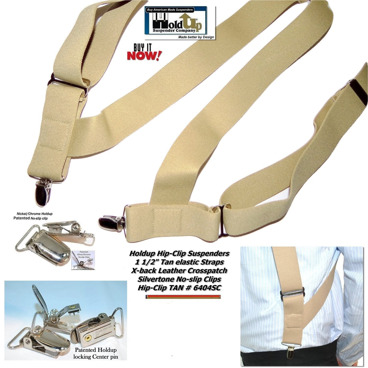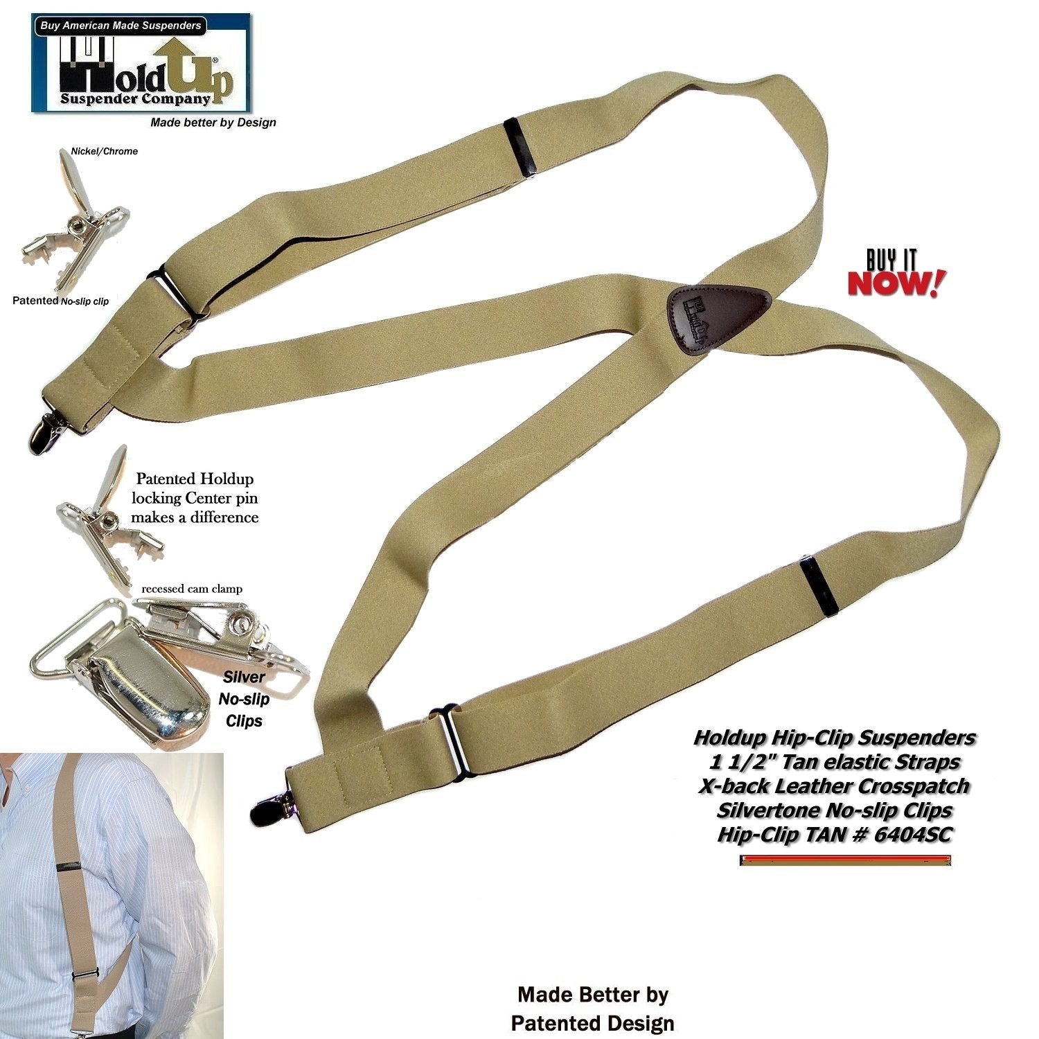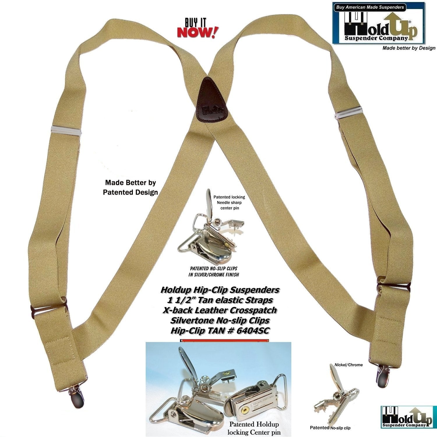Hold-Ups Tan Trucker Style Hip-clip Series Suspenders in 1 1/2" Width and USA Patented No-slip Silver Clips