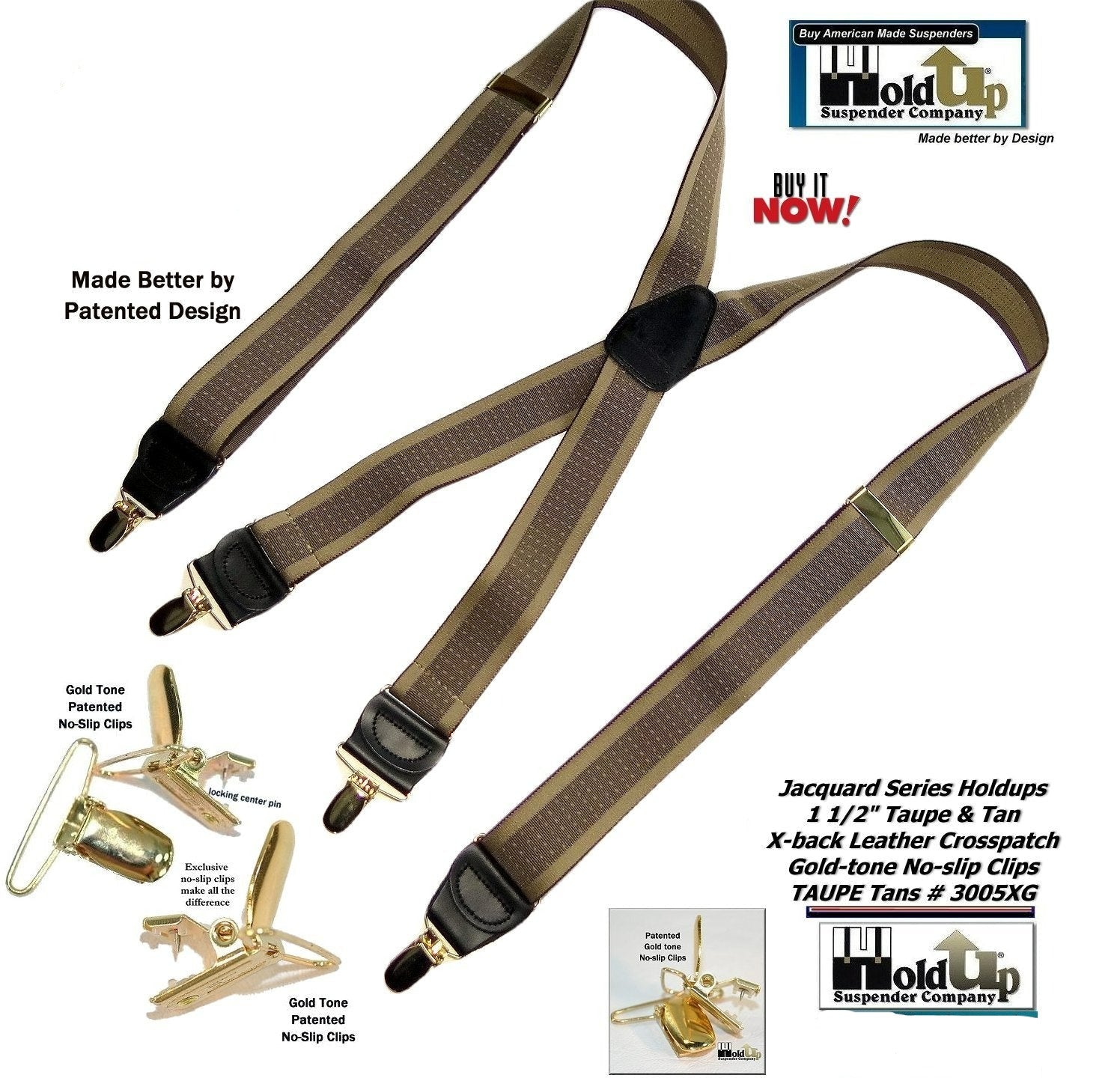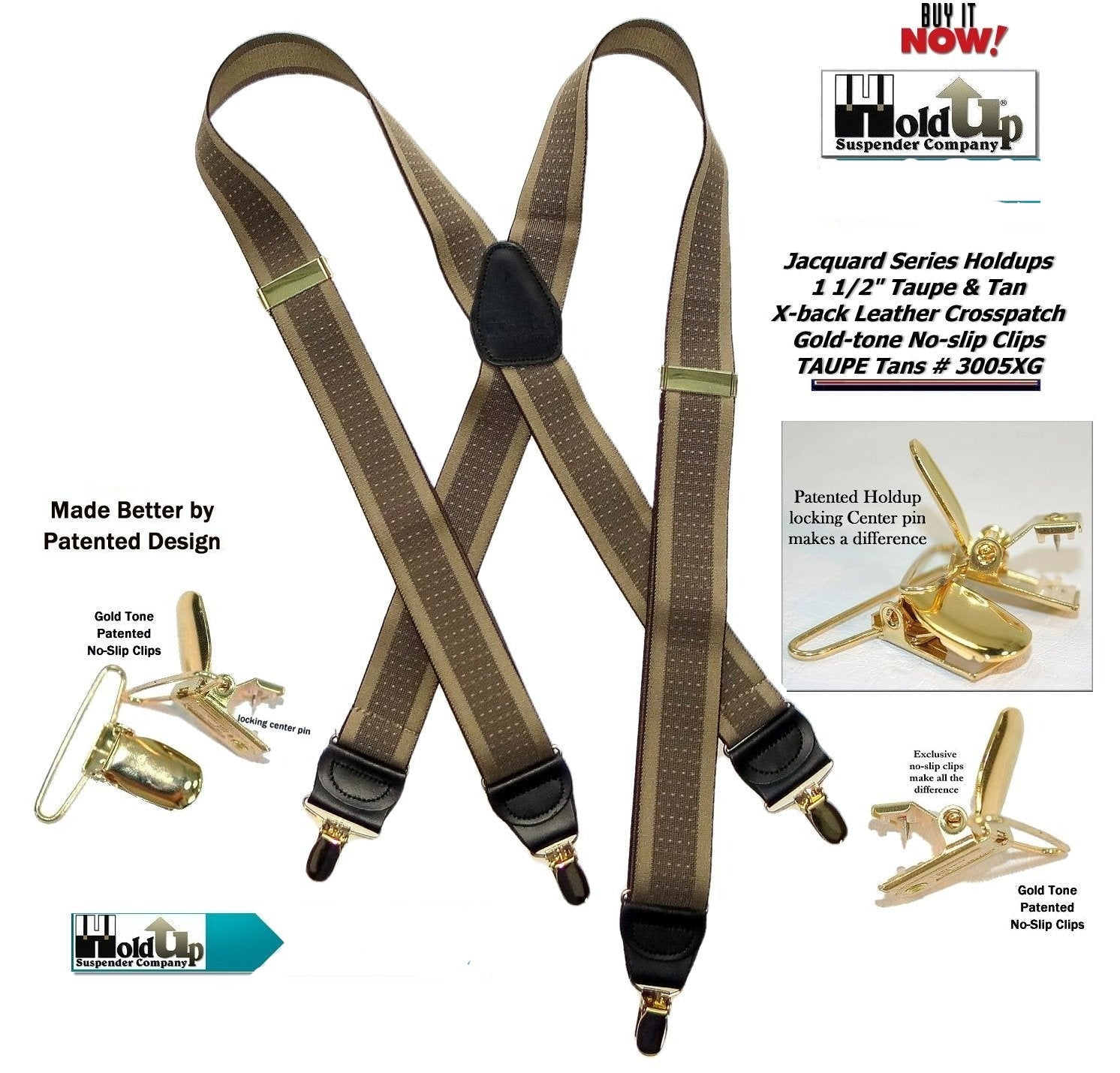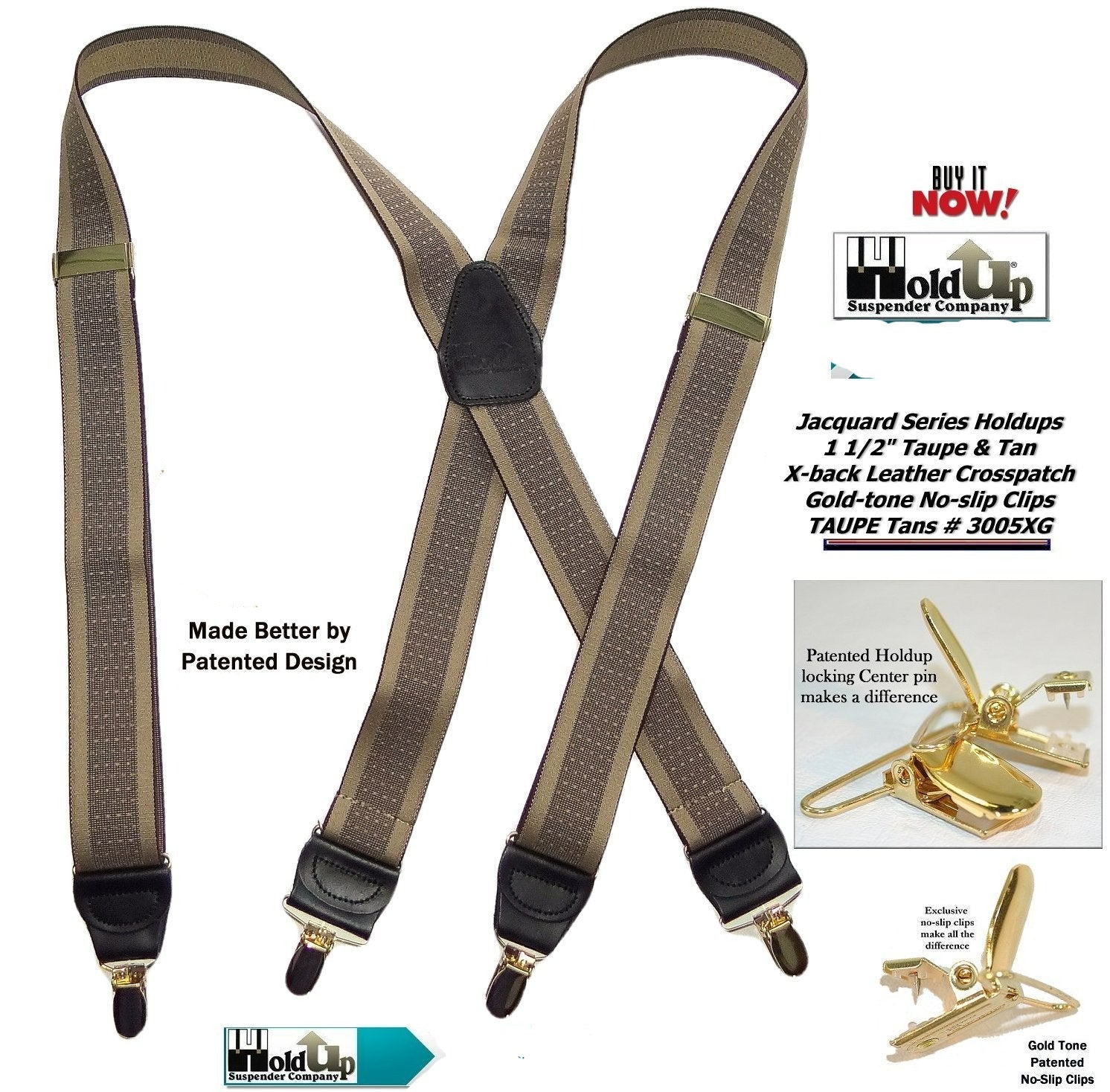 - These Holdup jacquard weave tan and taupe weave X-back suspenders have 30 day 100% satisfaction money back guarantee and they're by Holdup Suspender Company
