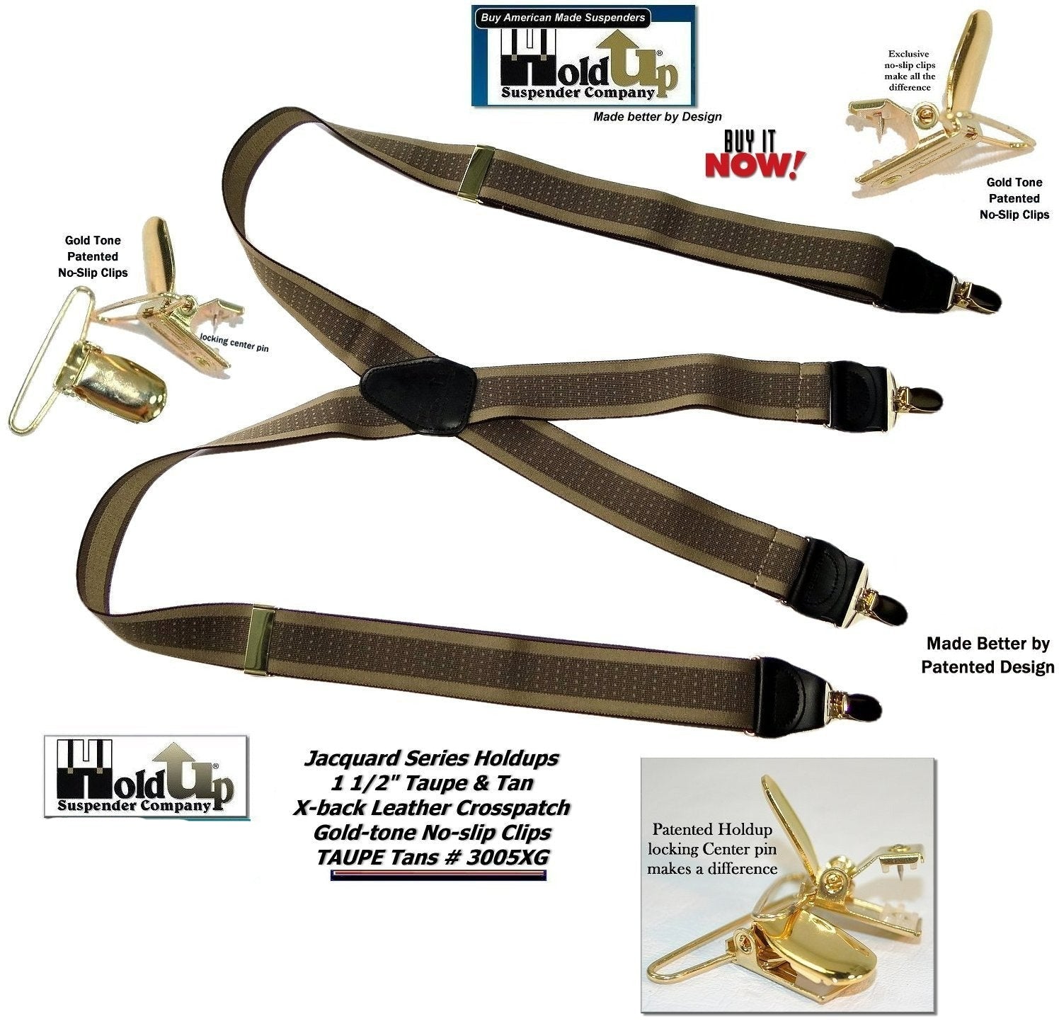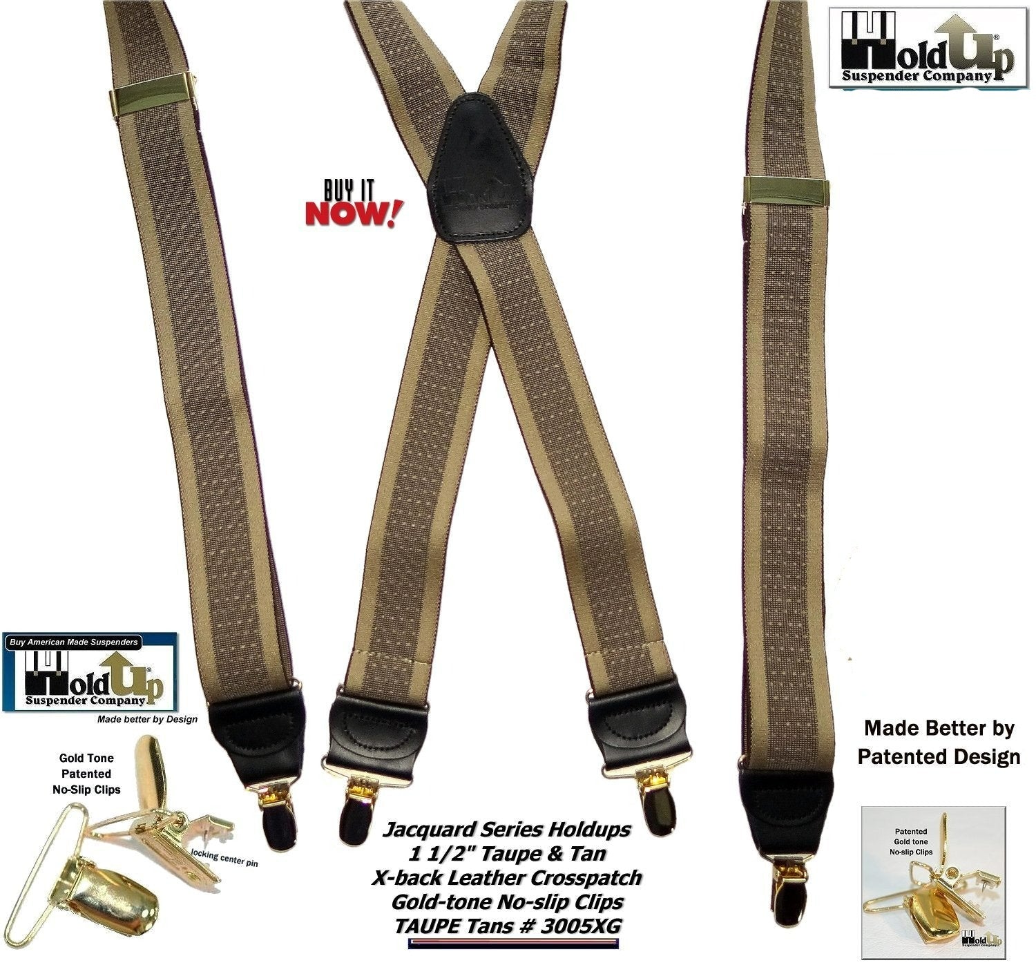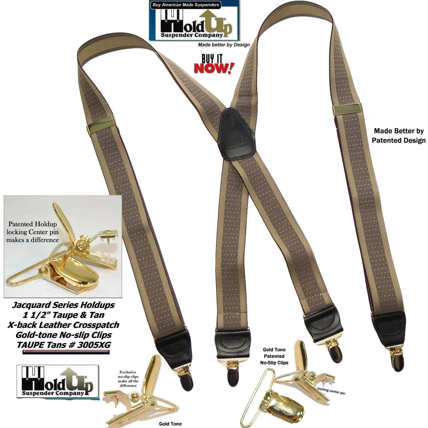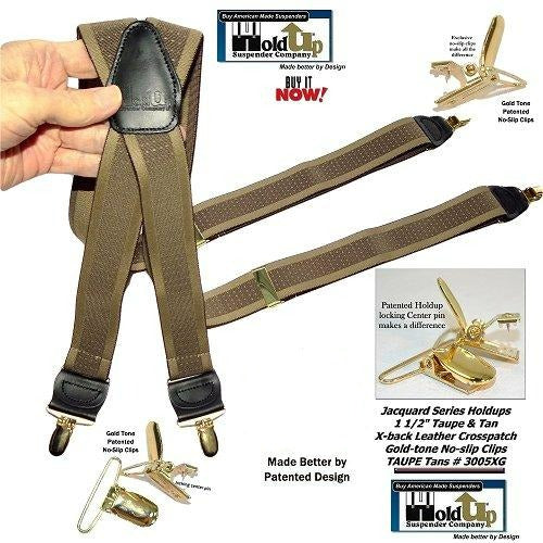 - These Holdup jacquard weave tan and taupe weave X-back suspenders have 30 day 100% satisfaction money back guarantee and they're by Holdup Suspender Company