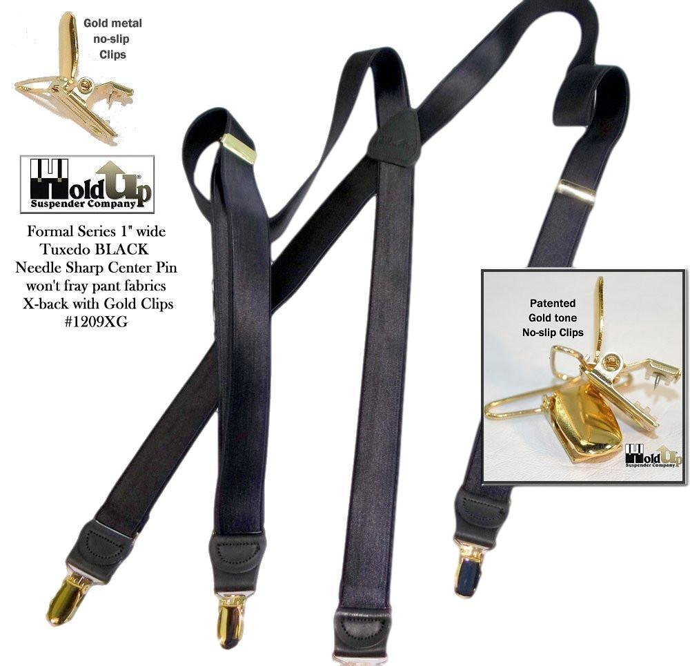 Holdup Brand Tuxedo Black 1" wide Satin Finish X-back Style Suspenders with USA Patented No-slip Gold clips