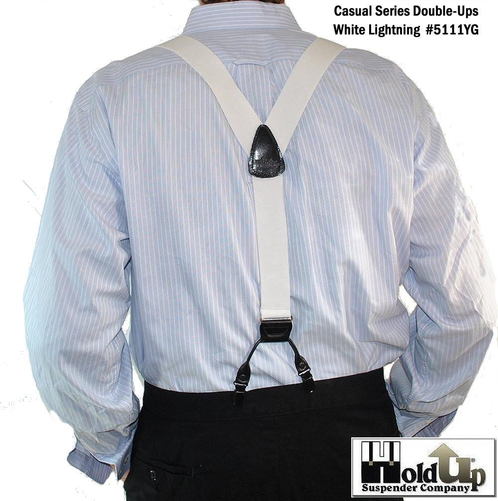 - Trademarked white Double-Ups style y-back Holdup brand dressy suspender for wearing with solid colored or plaid shirts at casual or formal events
