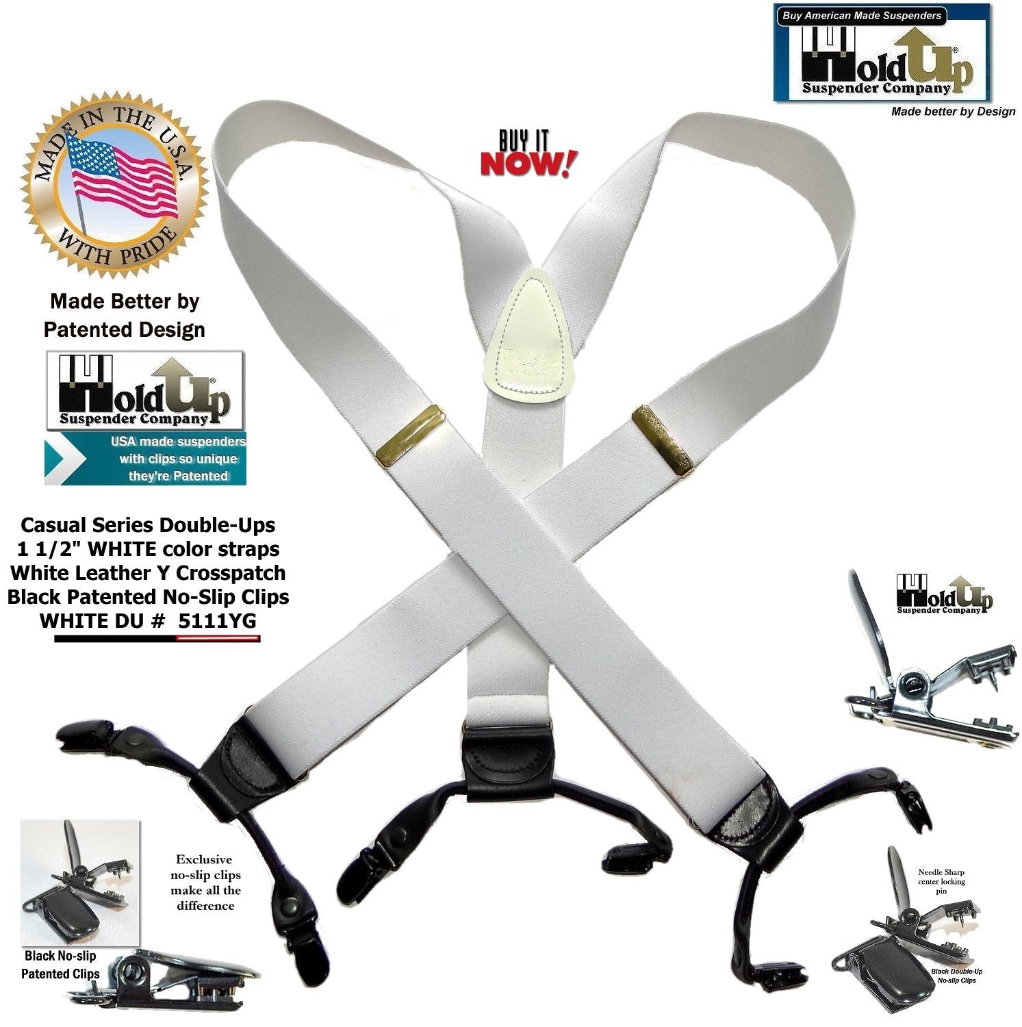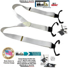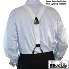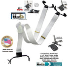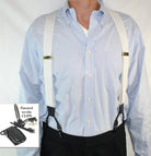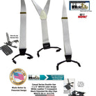 Holdup Suspender Company presents the Double-Ups in a pure White Lightning flat finished color for business and casual wear featuring our newly redesigned black no-slip suspender clip. These are 1 1/2" wide and 48" long (adjustable to fit men over 6 feet tall). This traditional style mirrors the look of button-on white suspenders worn since they were first invented. Sal Herman, the President of Holdup Suspender Co., worked for years to perfect these stunning white suspender braces still popular with newscasters, doctors, businessmen, and professors who wear these with solid or plaid dress shirts. By eliminating the custom tailoring requirement to sew suspender buttons onto every pair of pants you wish to wear with suspenders...now you can easily attach your All white Double-Ups to your entire wardrobe of pants in a snap of a patented center pin type clip. Purchase these with your Amazon or PayPal account and get a free freight offer during checkout.