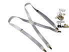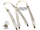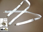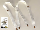 Hold-ups Formal Wear Series WHITE NIGHTS pure white suspenders featuring our patented No-slip clip in silver tone. These feature a new 1" narrower width in a X-back style and white leather trim. These are 48" long (adjustable). The image above really doesn't do justice to the SATIN finished colors of these businessman's suspenders. The top grade WHITE leather tabs and cross patch, plus the special white backing, add up to a more formal look. Why should you ever have to suffer through the agony of those cheap tuxedo rental shop pair that never seem to hold up. You owe it to yourself to get our exclusive formal series of men's suspenders designed for a lifetime of parties and social events. All Formal Series Holdups satin finished materials are carefully chosen for durability, pleasing look and above all they'll never Pop Off at the least opportune time.