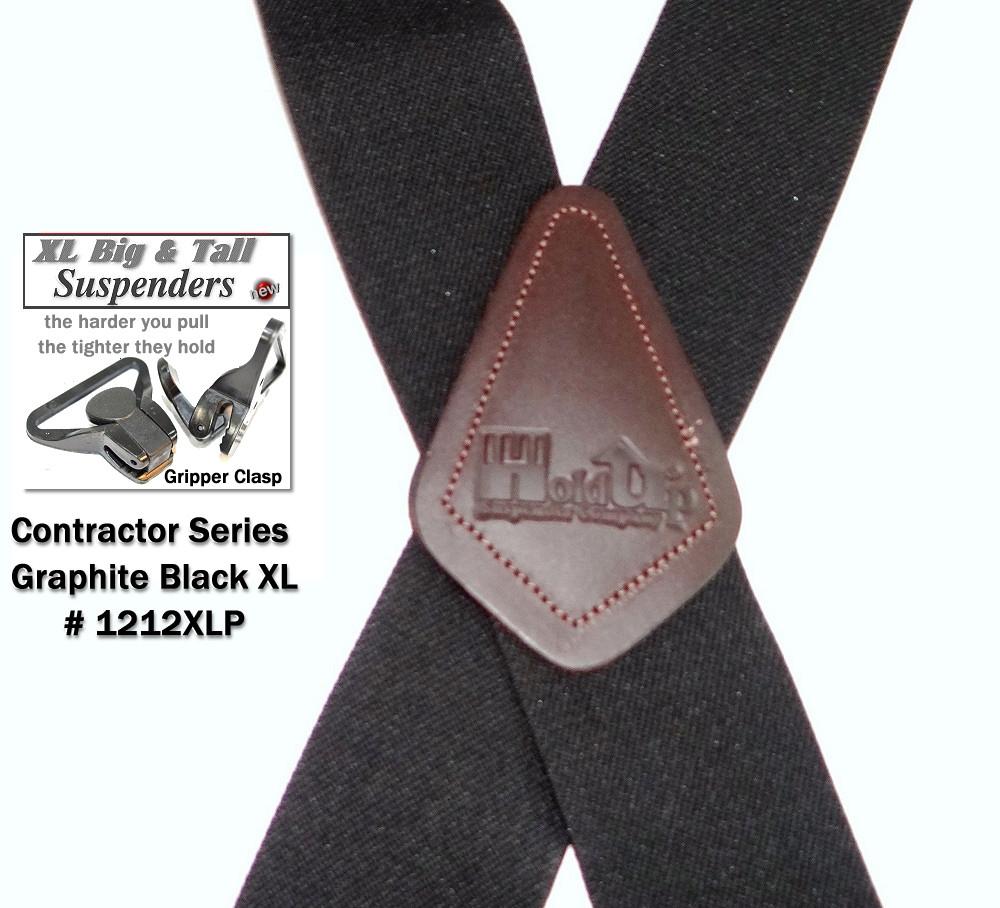 These 54" Extra Long Graphite BLACK colored 2" wide Jumbo XL Contractor Series suspenders are specifically designed for securely holding up a bigger man's pants for years of wear. The super strength USA Patented Gripper Clasps holds up pants and tool belts at the same time in total comfort. With everything imaginable hanging from your trousers it's hard to keep them up with just an ordinary belt. The contractor suspender is specially designed with wider cotton poly-blend straps and our USA patented super strong composite plastic Gripper Clasp to assure you're pants are Always Up with maximum comfort. These make perfect gifts for that hard working Big and Tall man who knows the limitations of conventional suspenders. This style has 4 BLACK composite plastic patented gripper clasps for extra holding power. The USA patented plastic gripper clasps are cam activated which means the harder you pull on them the tighter they grip. All the Cotton poly-blend elastic materials are carefully chosen for elastic durability, good looks and are guaranteed to never slip, slide, or fly off your work pants. Buy one of these tasteful Graphite BLACK color Contractor Series suspenders with patented Jumbo Plastic Gripper Clasps.