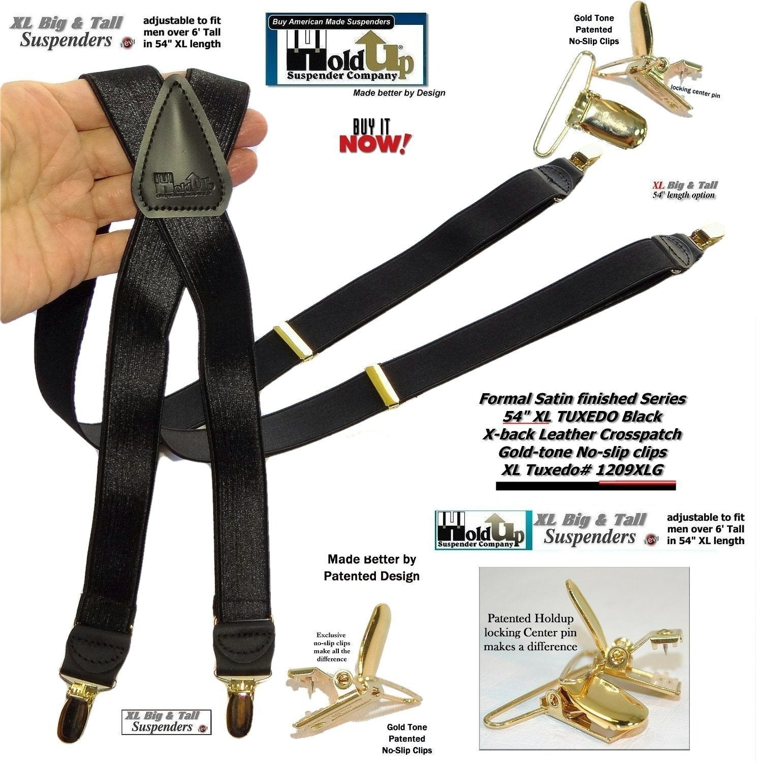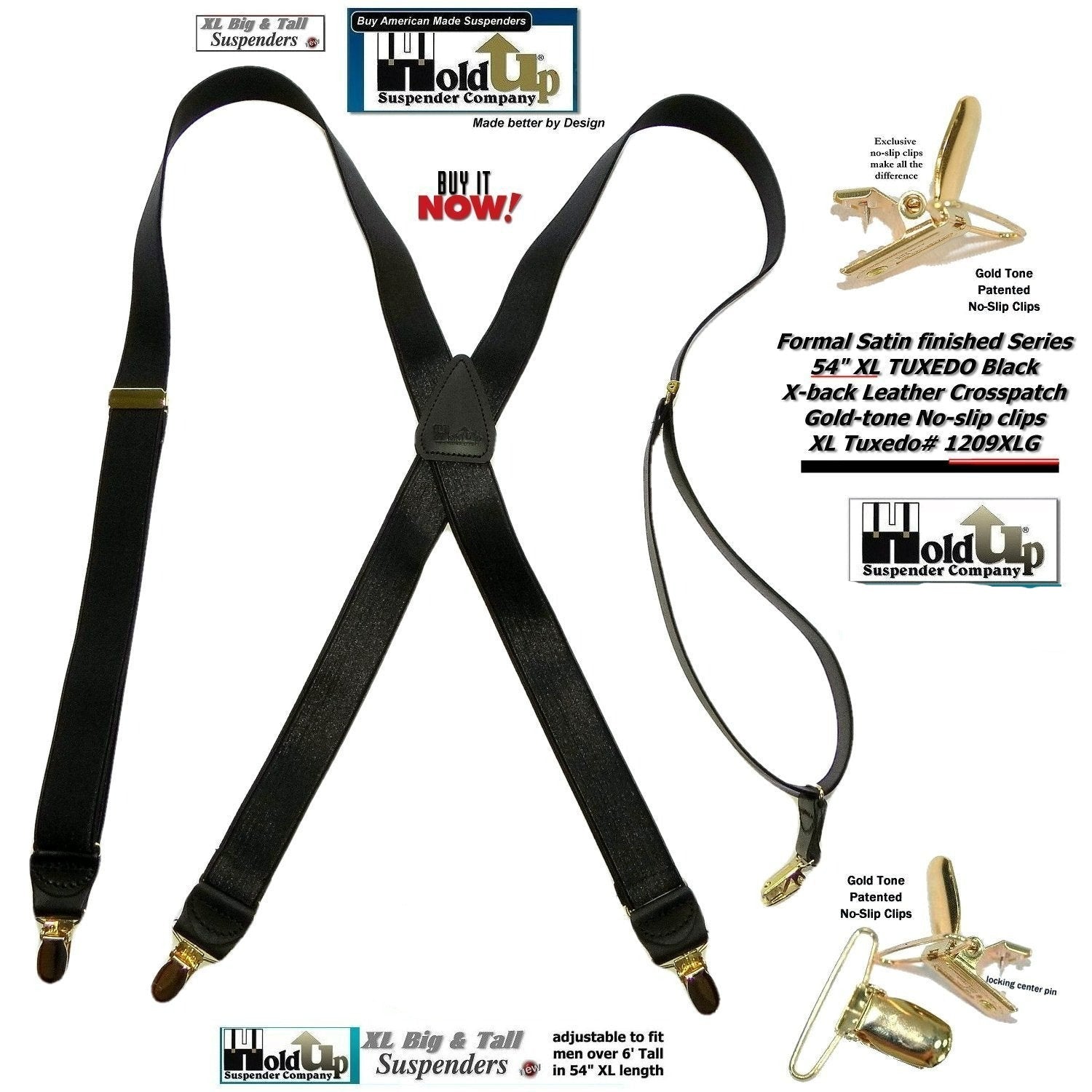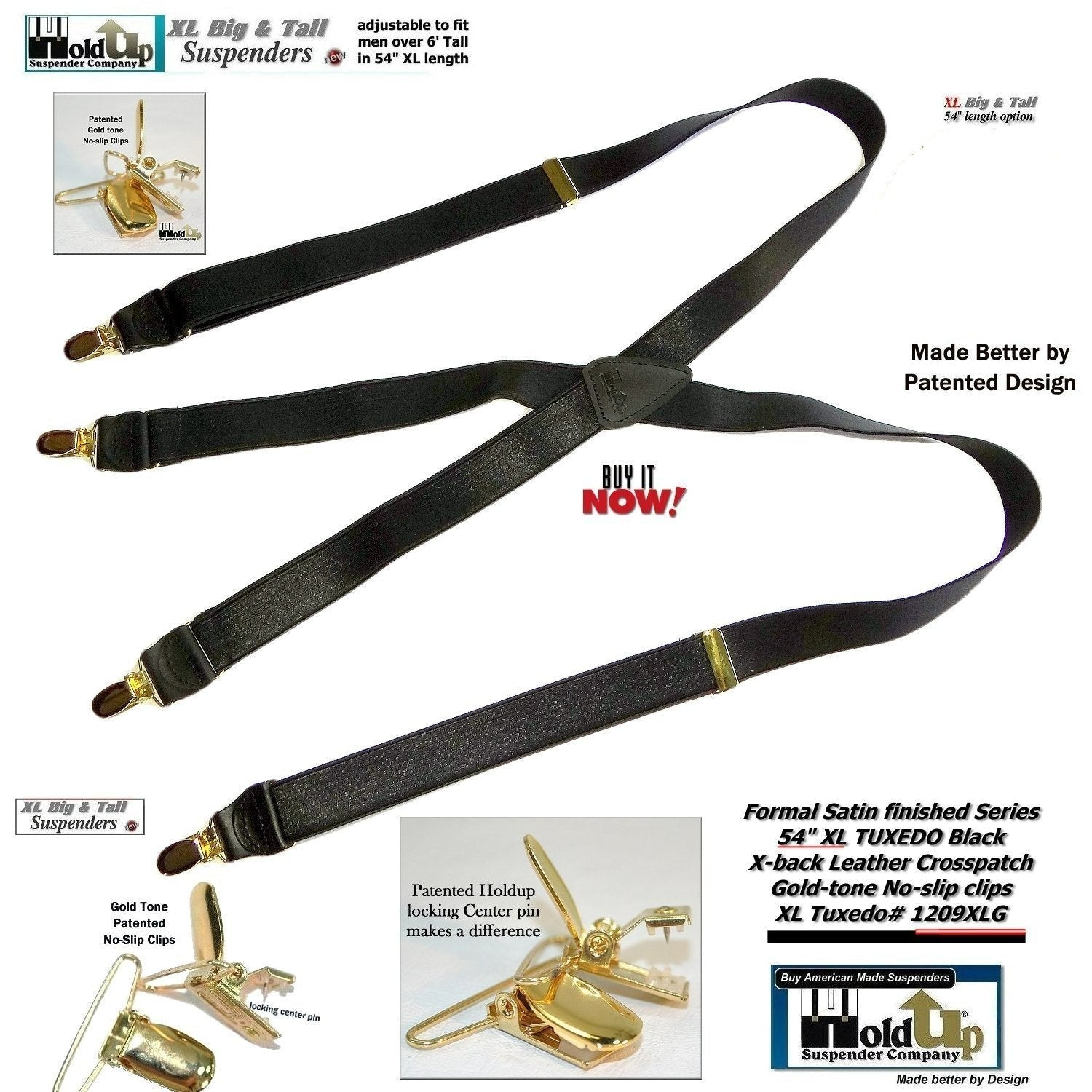 54" extra Long Hold-up Formal Wear Series TUXEDO BLACK suspenders featuring our patented gold toned No-slip clip in new 1" wide satin finished elastic straps. The image above really doesn't do justice to the SATIN finished tuxedo black colorĀ of these businessman's suspenders. These suspenders are 54" long (adjustable) and perfect for the Big and/or Tall man well over 6 feet tall. The top grade black leather tabs and X-back top grade blackĀ leather crosspatch give these Holdups a more formal look. Why should you ever have to suffer through the agony of those cheap tuxedo rental shop pair that never seem to hold up. You owe it to yourself to get our exclusive formal series of men's suspenders designed for a lifetime of parties and social events. All materials are carefully chosen for durability, pleasing look and above all they'll never Pop-Off at the least opportune time.Ā Buy these XL all black suspenders using your Amazon or PayPal account and get freeĀ a free freight offer at checkout.